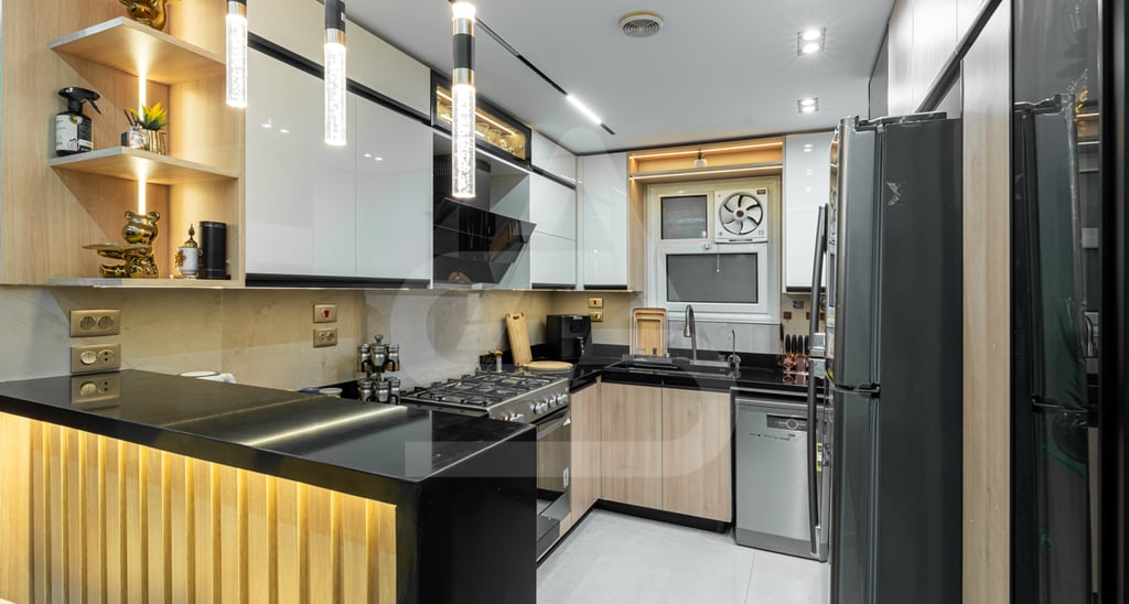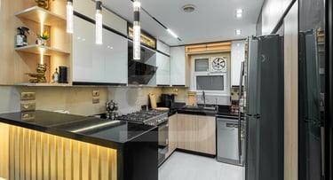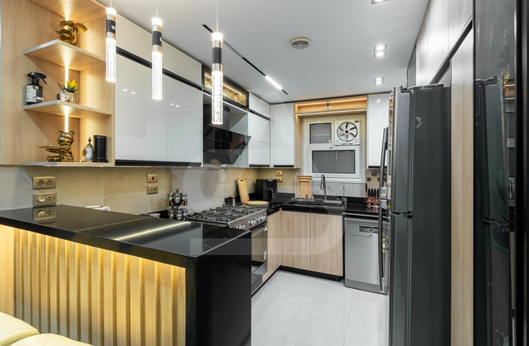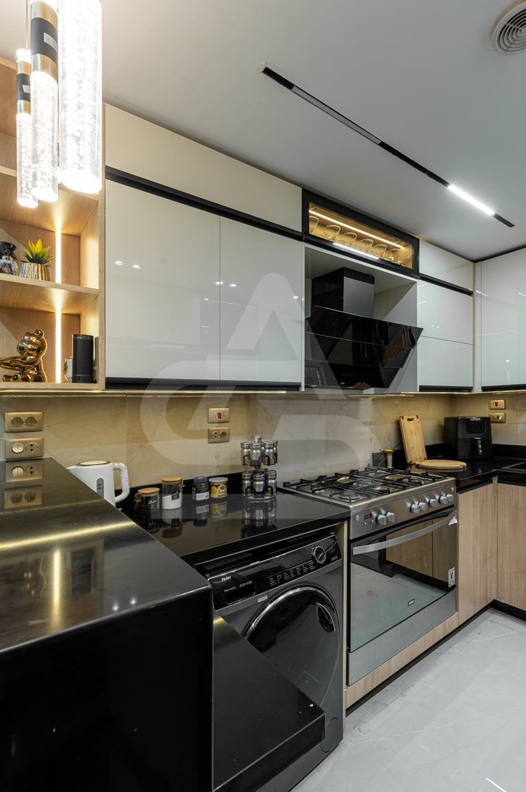 This kitchen feels sleek, compact, and confidently modern. Glossy white upper cabinets reflect the ceiling lights, visually expanding the space, while the light wood lower cabinetry adds warmth and balance. The black stone countertops and backsplash introduce contrast, grounding the palette with depth and sophistication. A fluted peninsula with integrated warm lighting becomes an immediate focal point, adding texture and a soft glow that elevates the overall design. Pendant lights with gold and black detailing hang above, adding a refined decorative touch that feels both contemporary and slightly luxurious.