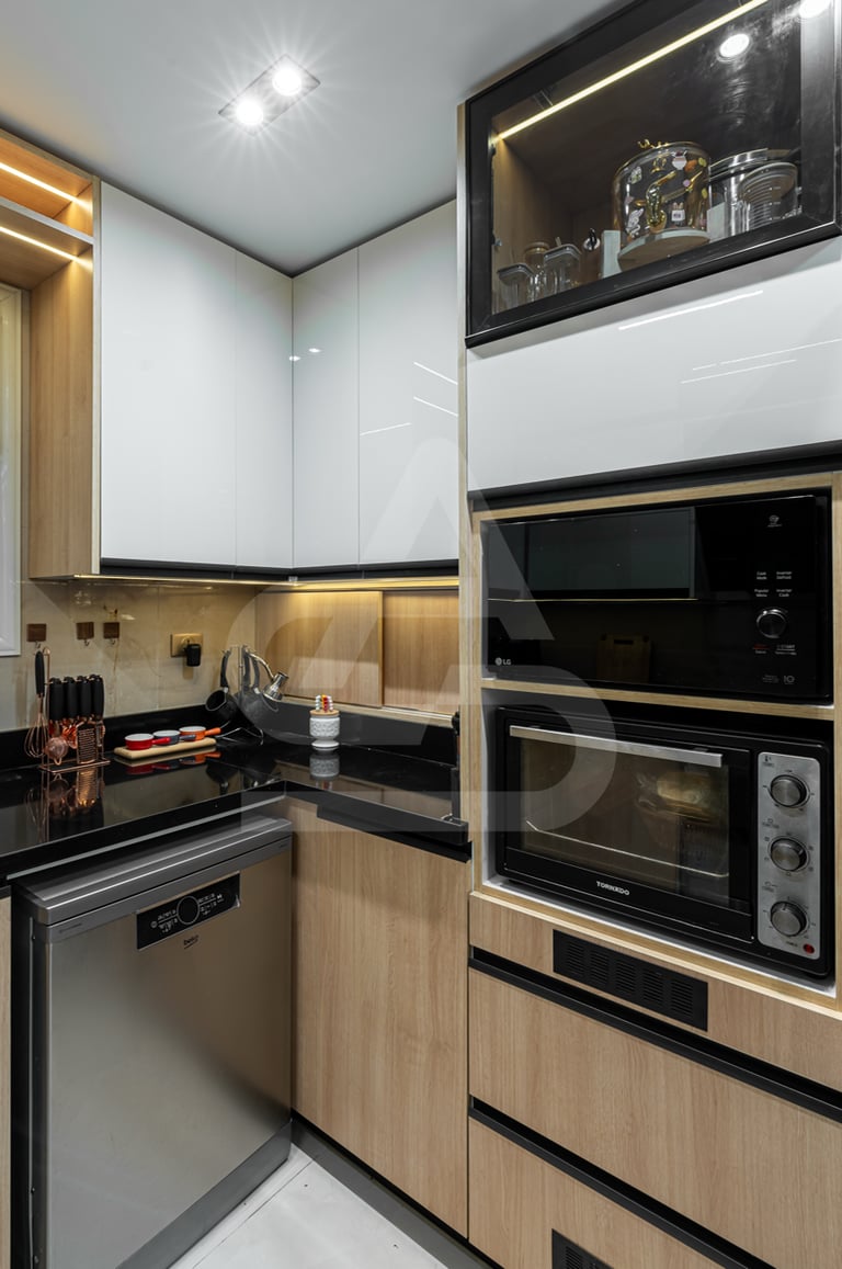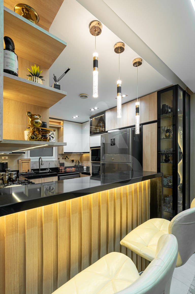 The story behind this kitchen feels like urban living done right. It belongs to someone who appreciates design but also understands practicality, someone who wants a kitchen that performs well during busy weekday mornings yet transforms into a stylish gathering corner at night. The illuminated fluted bar subtly turns the peninsula into a social anchor, where friends lean in with drinks while dinner cooks nearby. Its uniqueness lies in how it blends compact efficiency with visual drama; even within limited space, it manages to feel elevated, polished, and quietly expressive.