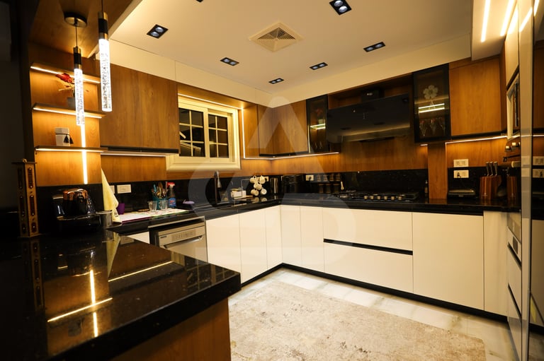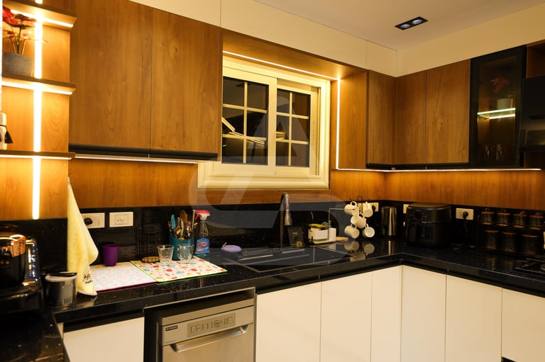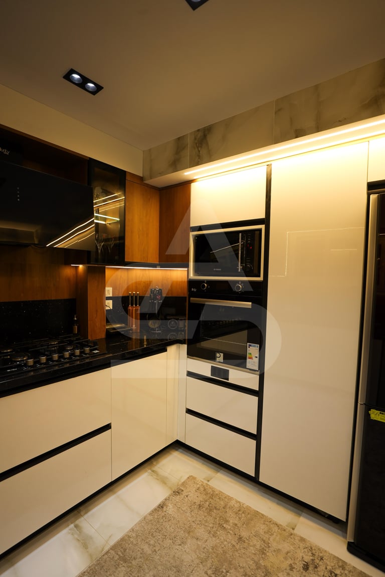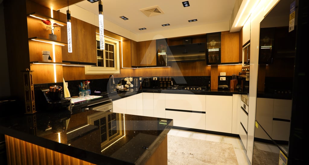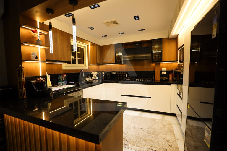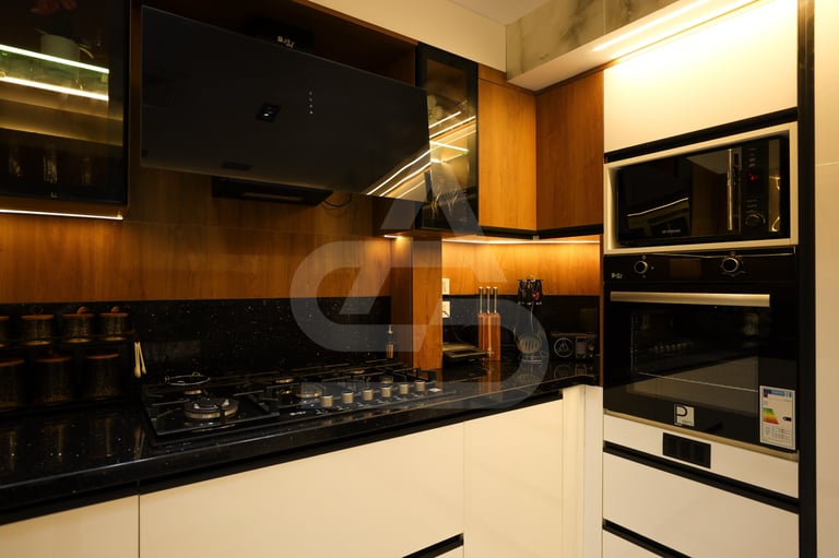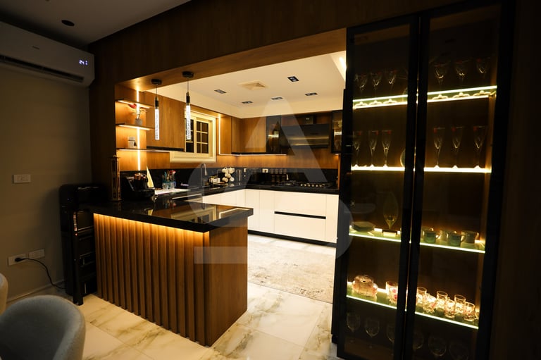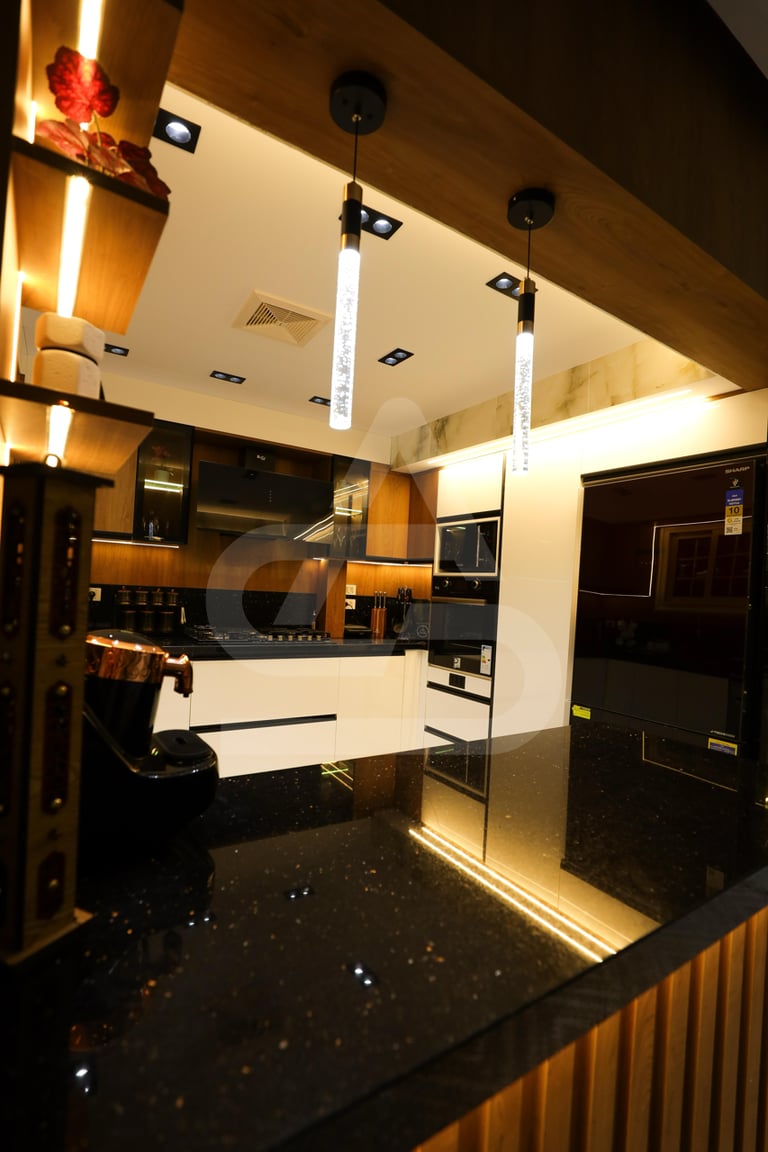The story behind this kitchen feels like one of evening gatherings and slow conversations. It is the kind of space that truly comes alive after sunset, when the hidden LEDs and pendant lights take over and the room transforms into a warm sanctuary. It belongs to someone who enjoys hosting intimate dinners, where music plays softly in the background and the glow of the lights reflects off polished surfaces. Its uniqueness lies in that theatrical lighting design, it doesn’t just illuminate the room, it frames it, almost like a stage where everyday moments feel slightly elevated, slightly more special than ordinary.