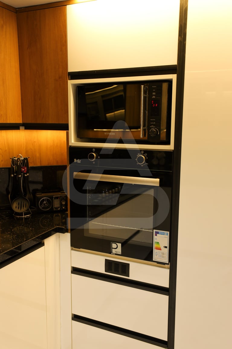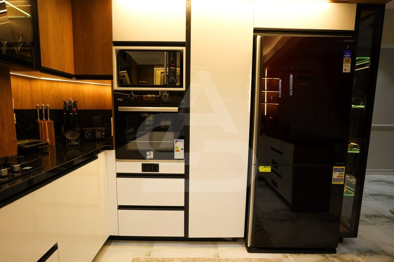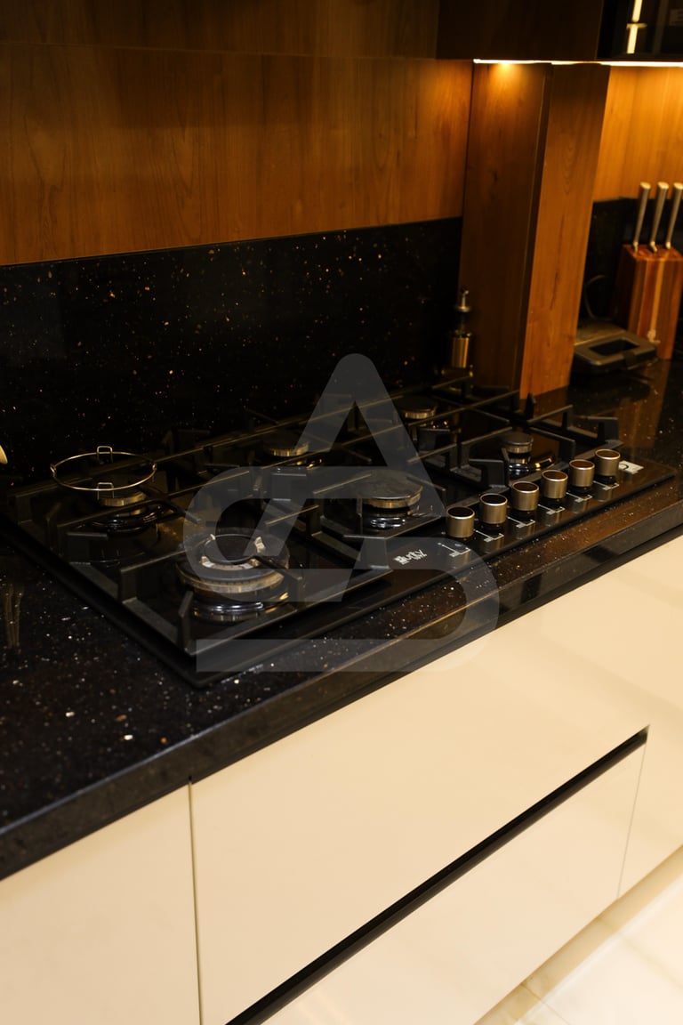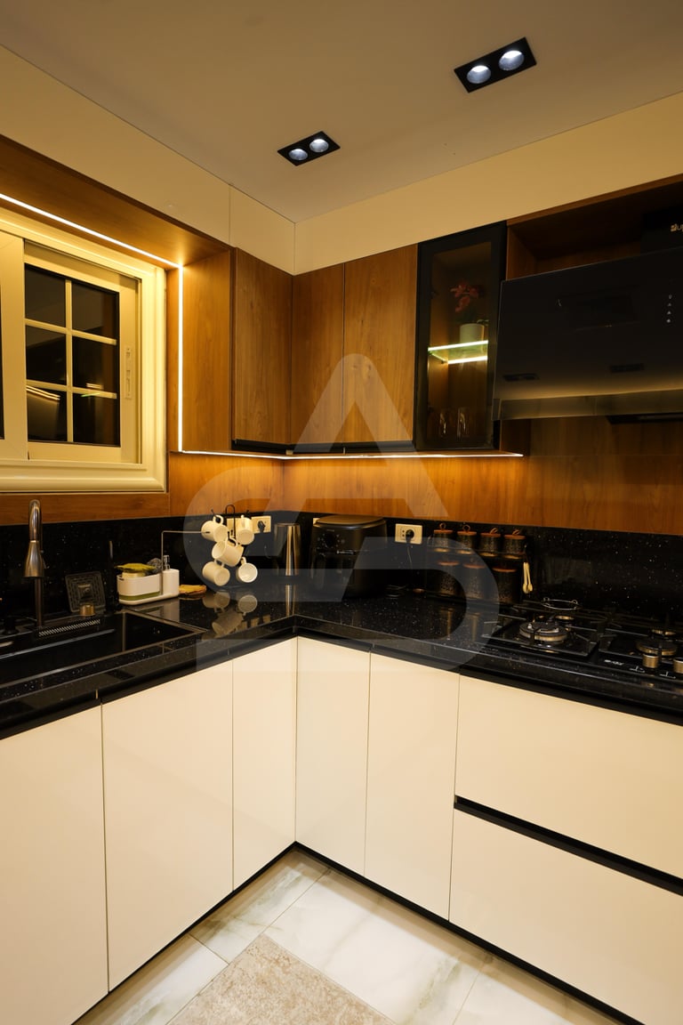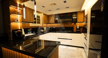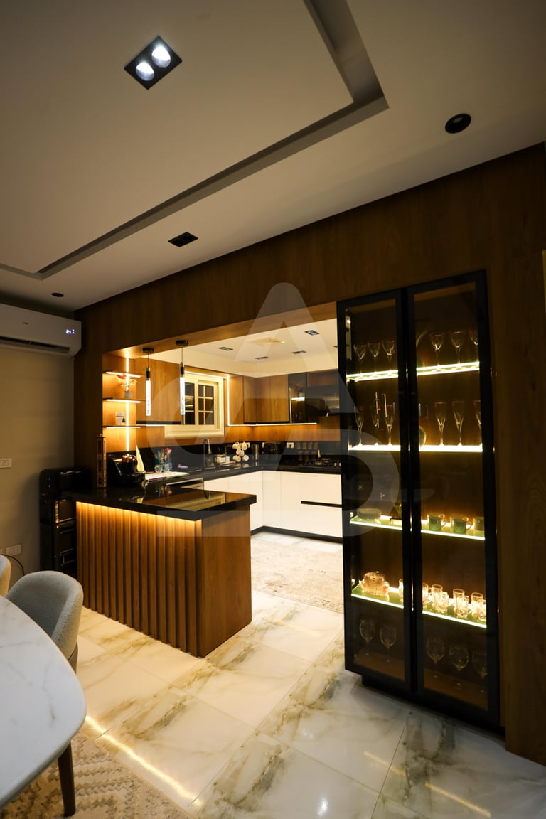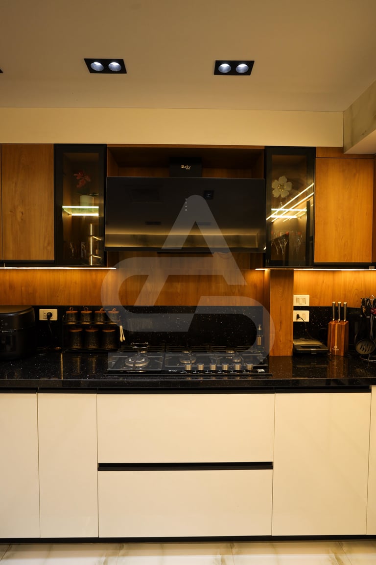 The story behind this kitchen feels like one of evening gatherings and slow conversations. It is the kind of space that truly comes alive after sunset, when the hidden LEDs and pendant lights take over and the room transforms into a warm sanctuary. It belongs to someone who enjoys hosting intimate dinners, where music plays softly in the background and the glow of the lights reflects off polished surfaces. Its uniqueness lies in that theatrical lighting design, it doesn’t just illuminate the room, it frames it, almost like a stage where everyday moments feel slightly elevated, slightly more special than ordinary.