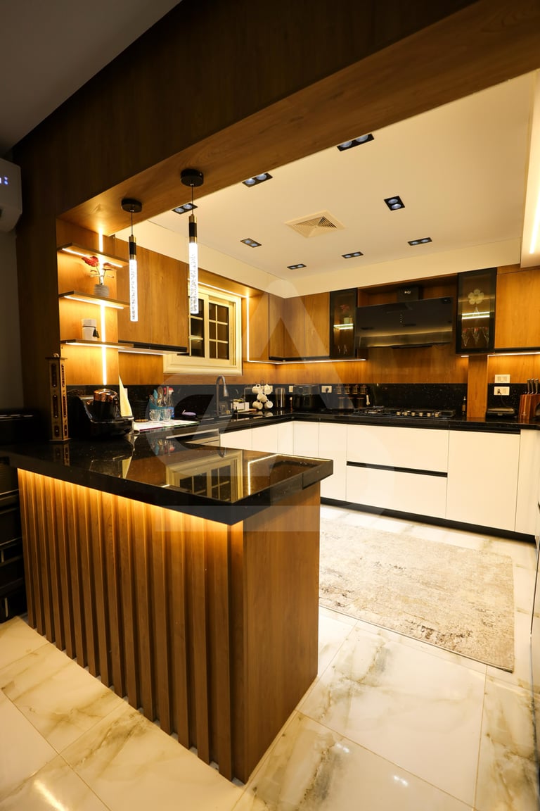 This kitchen is a bold expression of warmth and modern drama. Rich wood cabinetry wraps the walls in a deep honey tone, contrasted by sleek white lower cabinets that keep the space visually balanced. The glossy black countertops and backsplash reflect the layered lighting, creating depth and a subtle sense of luxury. Vertical and horizontal LED strips are integrated seamlessly into the shelving and cabinetry, outlining the architecture and giving the room a cinematic glow. The pendant lights above the peninsula add a sculptural touch, drawing the eye downward to the polished black surface that mirrors the entire space like glass.