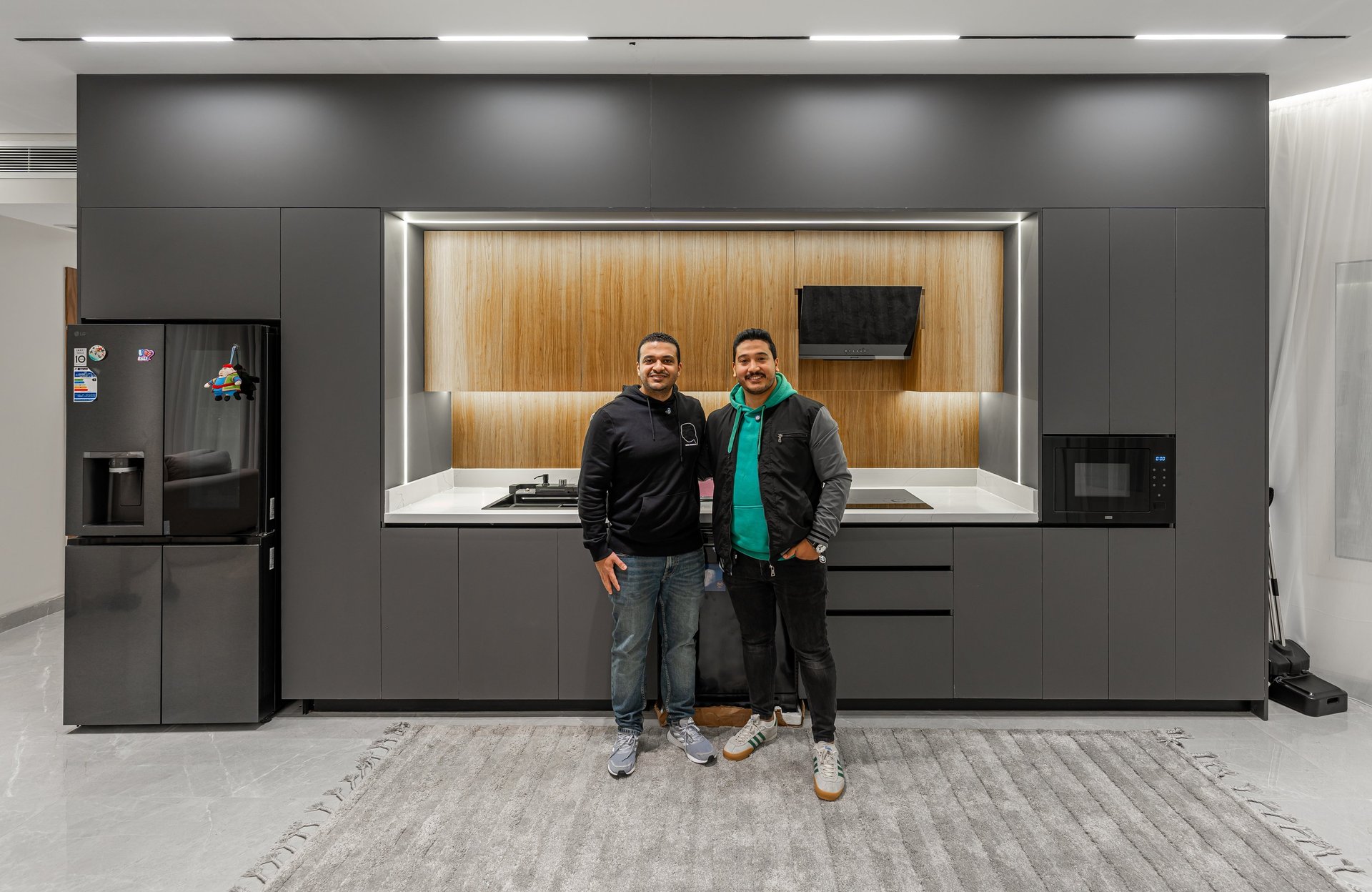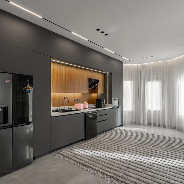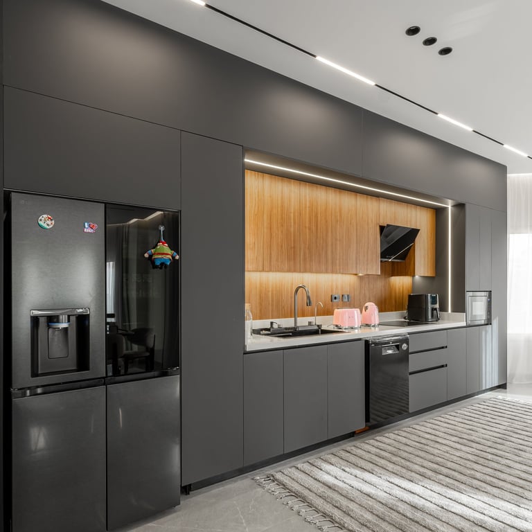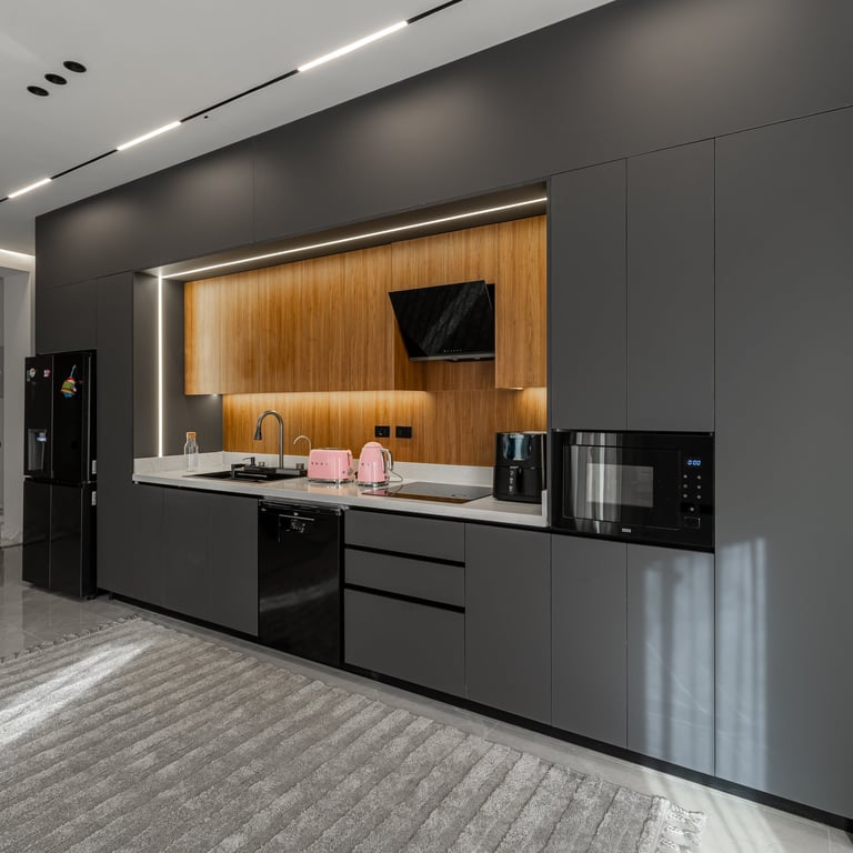 This kitchen represents urban living done right, appealing to someone who values design and practicality. The illuminated bar turns the peninsula into a social hub, blending efficiency with visual drama, making it feel elevated and expressive.