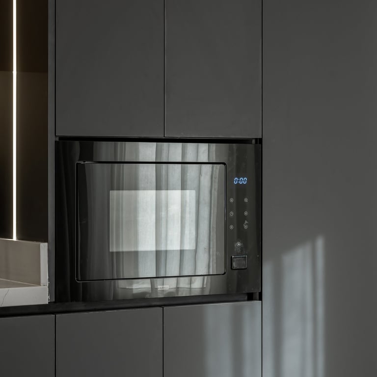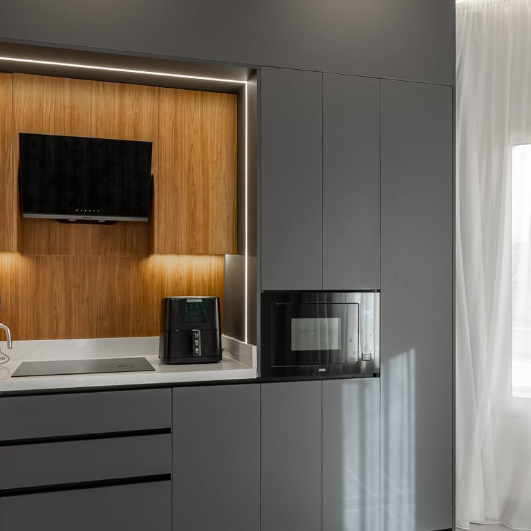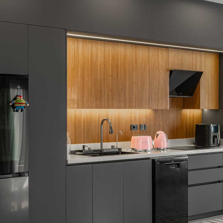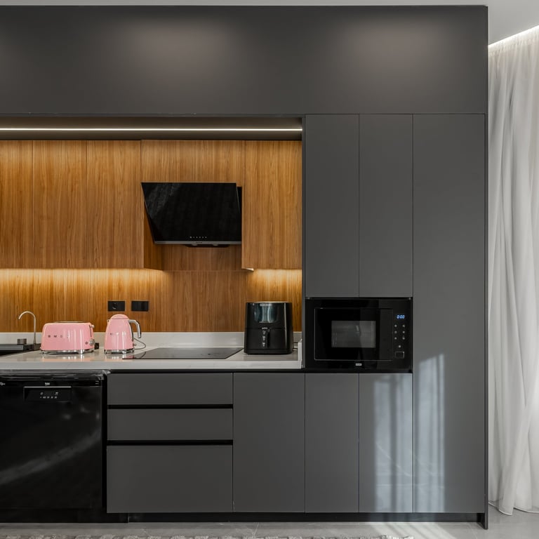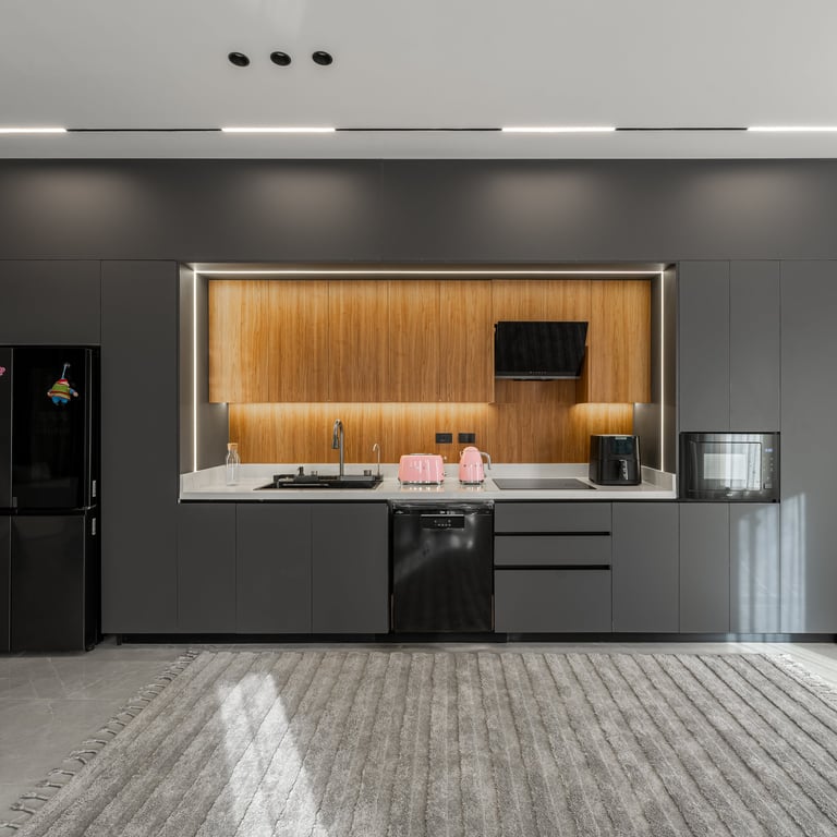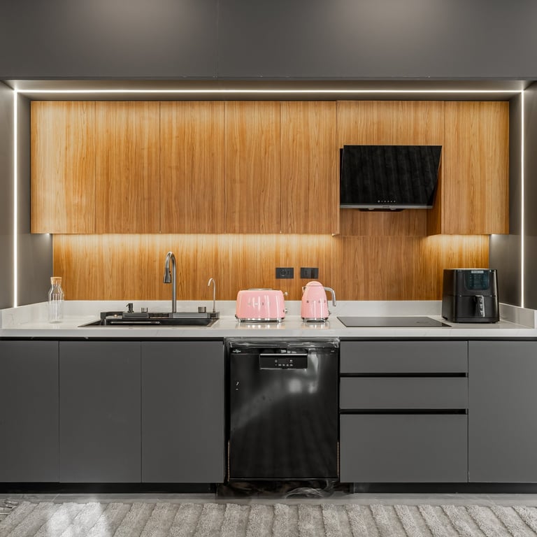 The efficient layout makes the most of the compact space, with stainless steel appliances reinforcing the modern aesthetic and open wooden shelving adding personality. Under-cabinet lighting ensures functionality while maintaining atmosphere. Every surface feels clean and deliberate, with layered lighting that avoids a purely utilitarian feel.